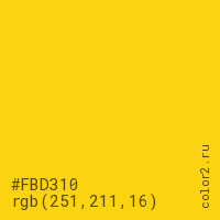 Цвет #FBD310 в цветовой модели RGB обозначается тремя октетами (251, 211, 16) в десятичном формате и #FBD310 в шестнадцатиричном (hex) формате, которые являются интенсивностью красного 251 (hex FB), интенсивность зелёного 211 (hex D3) и интенсивность синего 16 (hex 10).