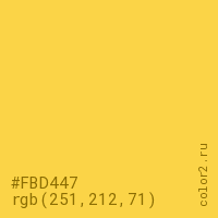 Цвет #FBD447 в цветовой модели RGB обозначается тремя октетами (251, 212, 71) в десятичном формате и #FBD447 в шестнадцатиричном (hex) формате, которые являются интенсивностью красного 251 (hex FB), интенсивность зелёного 212 (hex D4) и интенсивность синего 71 (hex 47).