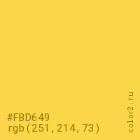 Цвет #FBD649 в цветовой модели RGB обозначается тремя октетами (251, 214, 73) в десятичном формате и #FBD649 в шестнадцатиричном (hex) формате, которые являются интенсивностью красного 251 (hex FB), интенсивность зелёного 214 (hex D6) и интенсивность синего 73 (hex 49).
