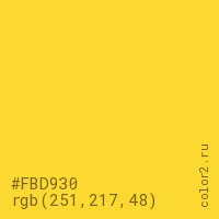 Цвет #FBD930 в цветовой модели RGB обозначается тремя октетами (251, 217, 48) в десятичном формате и #FBD930 в шестнадцатиричном (hex) формате, которые являются интенсивностью красного 251 (hex FB), интенсивность зелёного 217 (hex D9) и интенсивность синего 48 (hex 30).