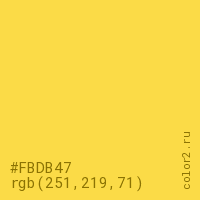 Цвет #FBDB47 в цветовой модели RGB обозначается тремя октетами (251, 219, 71) в десятичном формате и #FBDB47 в шестнадцатиричном (hex) формате, которые являются интенсивностью красного 251 (hex FB), интенсивность зелёного 219 (hex DB) и интенсивность синего 71 (hex 47).