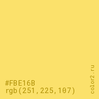 Цвет #FBE16B в цветовой модели RGB обозначается тремя октетами (251, 225, 107) в десятичном формате и #FBE16B в шестнадцатиричном (hex) формате, которые являются интенсивностью красного 251 (hex FB), интенсивность зелёного 225 (hex E1) и интенсивность синего 107 (hex 6B).