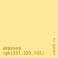 Цвет #FBE998 в цветовой модели RGB обозначается тремя октетами (251, 233, 152) в десятичном формате и #FBE998 в шестнадцатиричном (hex) формате, которые являются интенсивностью красного 251 (hex FB), интенсивность зелёного 233 (hex E9) и интенсивность синего 152 (hex 98).