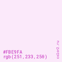 Цвет RGB(251, 233, 250) в процентом отношении количества цвета состоит из 98.4% красного (red), 91.4% зелёного (green) и 98% синего (blue).
