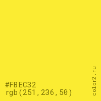 Цвет #FBEC32 в цветовой модели RGB обозначается тремя октетами (251, 236, 50) в десятичном формате и #FBEC32 в шестнадцатиричном (hex) формате, которые являются интенсивностью красного 251 (hex FB), интенсивность зелёного 236 (hex EC) и интенсивность синего 50 (hex 32).