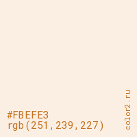 Цвет #FBEFE3 в цветовой модели RGB обозначается тремя октетами (251, 239, 227) в десятичном формате и #FBEFE3 в шестнадцатиричном (hex) формате, которые являются интенсивностью красного 251 (hex FB), интенсивность зелёного 239 (hex EF) и интенсивность синего 227 (hex E3).