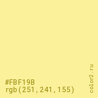 Цвет #FBF19B в цветовой модели RGB обозначается тремя октетами (251, 241, 155) в десятичном формате и #FBF19B в шестнадцатиричном (hex) формате, которые являются интенсивностью красного 251 (hex FB), интенсивность зелёного 241 (hex F1) и интенсивность синего 155 (hex 9B).