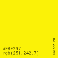 Цвет #FBF207 в цветовой модели RGB обозначается тремя октетами (251, 242, 7) в десятичном формате и #FBF207 в шестнадцатиричном (hex) формате, которые являются интенсивностью красного 251 (hex FB), интенсивность зелёного 242 (hex F2) и интенсивность синего 7 (hex 07).