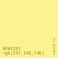 Цвет #FBF292 в цветовой модели RGB обозначается тремя октетами (251, 242, 146) в десятичном формате и #FBF292 в шестнадцатиричном (hex) формате, которые являются интенсивностью красного 251 (hex FB), интенсивность зелёного 242 (hex F2) и интенсивность синего 146 (hex 92).