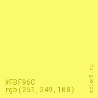 Цвет #FBF96C в цветовой модели RGB обозначается тремя октетами (251, 249, 108) в десятичном формате и #FBF96C в шестнадцатиричном (hex) формате, которые являются интенсивностью красного 251 (hex FB), интенсивность зелёного 249 (hex F9) и интенсивность синего 108 (hex 6C).