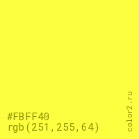 Цвет #FBFF40 в цветовой модели RGB обозначается тремя октетами (251, 255, 64) в десятичном формате и #FBFF40 в шестнадцатиричном (hex) формате, которые являются интенсивностью красного 251 (hex FB), интенсивность зелёного 255 (hex FF) и интенсивность синего 64 (hex 40).