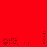 Цвет #FC0112 в цветовой модели RGB обозначается тремя октетами (252, 1, 18) в десятичном формате и #FC0112 в шестнадцатиричном (hex) формате, которые являются интенсивностью красного 252 (hex FC), интенсивность зелёного 1 (hex 01) и интенсивность синего 18 (hex 12).