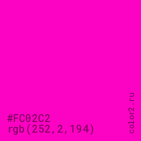 Цвет #FC02C2 в цветовой модели RGB обозначается тремя октетами (252, 2, 194) в десятичном формате и #FC02C2 в шестнадцатиричном (hex) формате, которые являются интенсивностью красного 252 (hex FC), интенсивность зелёного 2 (hex 02) и интенсивность синего 194 (hex C2).
