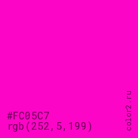 Цвет #FC05C7 в цветовой модели RGB обозначается тремя октетами (252, 5, 199) в десятичном формате и #FC05C7 в шестнадцатиричном (hex) формате, которые являются интенсивностью красного 252 (hex FC), интенсивность зелёного 5 (hex 05) и интенсивность синего 199 (hex C7).
