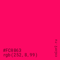 Цвет #FC0863 в цветовой модели RGB обозначается тремя октетами (252, 8, 99) в десятичном формате и #FC0863 в шестнадцатиричном (hex) формате, которые являются интенсивностью красного 252 (hex FC), интенсивность зелёного 8 (hex 08) и интенсивность синего 99 (hex 63).