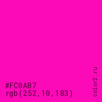 Цвет #FC0AB7 в цветовой модели RGB обозначается тремя октетами (252, 10, 183) в десятичном формате и #FC0AB7 в шестнадцатиричном (hex) формате, которые являются интенсивностью красного 252 (hex FC), интенсивность зелёного 10 (hex 0A) и интенсивность синего 183 (hex B7).