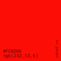 Цвет #FC0D06 в цветовой модели RGB обозначается тремя октетами (252, 13, 6) в десятичном формате и #FC0D06 в шестнадцатиричном (hex) формате, которые являются интенсивностью красного 252 (hex FC), интенсивность зелёного 13 (hex 0D) и интенсивность синего 6 (hex 06).