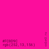 Цвет #FC0D9C в цветовой модели RGB обозначается тремя октетами (252, 13, 156) в десятичном формате и #FC0D9C в шестнадцатиричном (hex) формате, которые являются интенсивностью красного 252 (hex FC), интенсивность зелёного 13 (hex 0D) и интенсивность синего 156 (hex 9C).