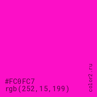 Цвет #FC0FC7 в цветовой модели RGB обозначается тремя октетами (252, 15, 199) в десятичном формате и #FC0FC7 в шестнадцатиричном (hex) формате, которые являются интенсивностью красного 252 (hex FC), интенсивность зелёного 15 (hex 0F) и интенсивность синего 199 (hex C7).