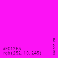 Цвет #FC12F5 в цветовой модели RGB обозначается тремя октетами (252, 18, 245) в десятичном формате и #FC12F5 в шестнадцатиричном (hex) формате, которые являются интенсивностью красного 252 (hex FC), интенсивность зелёного 18 (hex 12) и интенсивность синего 245 (hex F5).