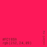 Цвет #FC1859 в цветовой модели RGB обозначается тремя октетами (252, 24, 89) в десятичном формате и #FC1859 в шестнадцатиричном (hex) формате, которые являются интенсивностью красного 252 (hex FC), интенсивность зелёного 24 (hex 18) и интенсивность синего 89 (hex 59).