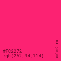 Цвет #FC2272 в цветовой модели RGB обозначается тремя октетами (252, 34, 114) в десятичном формате и #FC2272 в шестнадцатиричном (hex) формате, которые являются интенсивностью красного 252 (hex FC), интенсивность зелёного 34 (hex 22) и интенсивность синего 114 (hex 72).
