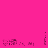Цвет #FC2296 в цветовой модели RGB обозначается тремя октетами (252, 34, 150) в десятичном формате и #FC2296 в шестнадцатиричном (hex) формате, которые являются интенсивностью красного 252 (hex FC), интенсивность зелёного 34 (hex 22) и интенсивность синего 150 (hex 96).