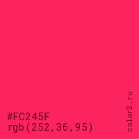 Цвет #FC245F в цветовой модели RGB обозначается тремя октетами (252, 36, 95) в десятичном формате и #FC245F в шестнадцатиричном (hex) формате, которые являются интенсивностью красного 252 (hex FC), интенсивность зелёного 36 (hex 24) и интенсивность синего 95 (hex 5F).
