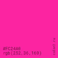 Цвет #FC24A0 в цветовой модели RGB обозначается тремя октетами (252, 36, 160) в десятичном формате и #FC24A0 в шестнадцатиричном (hex) формате, которые являются интенсивностью красного 252 (hex FC), интенсивность зелёного 36 (hex 24) и интенсивность синего 160 (hex A0).