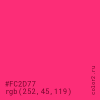 Цвет #FC2D77 в цветовой модели RGB обозначается тремя октетами (252, 45, 119) в десятичном формате и #FC2D77 в шестнадцатиричном (hex) формате, которые являются интенсивностью красного 252 (hex FC), интенсивность зелёного 45 (hex 2D) и интенсивность синего 119 (hex 77).