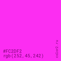 Цвет #FC2DF2 в цветовой модели RGB обозначается тремя октетами (252, 45, 242) в десятичном формате и #FC2DF2 в шестнадцатиричном (hex) формате, которые являются интенсивностью красного 252 (hex FC), интенсивность зелёного 45 (hex 2D) и интенсивность синего 242 (hex F2).
