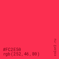 Цвет #FC2E50 в цветовой модели RGB обозначается тремя октетами (252, 46, 80) в десятичном формате и #FC2E50 в шестнадцатиричном (hex) формате, которые являются интенсивностью красного 252 (hex FC), интенсивность зелёного 46 (hex 2E) и интенсивность синего 80 (hex 50).