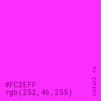Цвет #FC2EFF в цветовой модели RGB обозначается тремя октетами (252, 46, 255) в десятичном формате и #FC2EFF в шестнадцатиричном (hex) формате, которые являются интенсивностью красного 252 (hex FC), интенсивность зелёного 46 (hex 2E) и интенсивность синего 255 (hex FF).