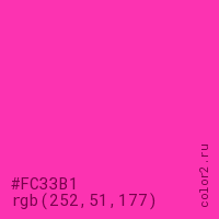 Цвет #FC33B1 в цветовой модели RGB обозначается тремя октетами (252, 51, 177) в десятичном формате и #FC33B1 в шестнадцатиричном (hex) формате, которые являются интенсивностью красного 252 (hex FC), интенсивность зелёного 51 (hex 33) и интенсивность синего 177 (hex B1).