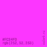 Цвет #FC34FD в цветовой модели RGB обозначается тремя октетами (252, 52, 253) в десятичном формате и #FC34FD в шестнадцатиричном (hex) формате, которые являются интенсивностью красного 252 (hex FC), интенсивность зелёного 52 (hex 34) и интенсивность синего 253 (hex FD).