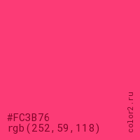 Цвет #FC3B76 в цветовой модели RGB обозначается тремя октетами (252, 59, 118) в десятичном формате и #FC3B76 в шестнадцатиричном (hex) формате, которые являются интенсивностью красного 252 (hex FC), интенсивность зелёного 59 (hex 3B) и интенсивность синего 118 (hex 76).