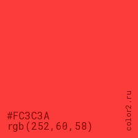 Цвет #FC3C3A в цветовой модели RGB обозначается тремя октетами (252, 60, 58) в десятичном формате и #FC3C3A в шестнадцатиричном (hex) формате, которые являются интенсивностью красного 252 (hex FC), интенсивность зелёного 60 (hex 3C) и интенсивность синего 58 (hex 3A).