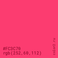 Цвет #FC3C70 в цветовой модели RGB обозначается тремя октетами (252, 60, 112) в десятичном формате и #FC3C70 в шестнадцатиричном (hex) формате, которые являются интенсивностью красного 252 (hex FC), интенсивность зелёного 60 (hex 3C) и интенсивность синего 112 (hex 70).