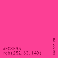 Цвет #FC3F95 в цветовой модели RGB обозначается тремя октетами (252, 63, 149) в десятичном формате и #FC3F95 в шестнадцатиричном (hex) формате, которые являются интенсивностью красного 252 (hex FC), интенсивность зелёного 63 (hex 3F) и интенсивность синего 149 (hex 95).