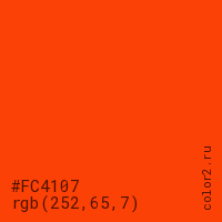 Цвет #FC4107 в цветовой модели RGB обозначается тремя октетами (252, 65, 7) в десятичном формате и #FC4107 в шестнадцатиричном (hex) формате, которые являются интенсивностью красного 252 (hex FC), интенсивность зелёного 65 (hex 41) и интенсивность синего 7 (hex 07).