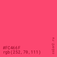 Цвет #FC466F в цветовой модели RGB обозначается тремя октетами (252, 70, 111) в десятичном формате и #FC466F в шестнадцатиричном (hex) формате, которые являются интенсивностью красного 252 (hex FC), интенсивность зелёного 70 (hex 46) и интенсивность синего 111 (hex 6F).