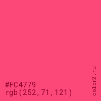 Цвет #FC4779 в цветовой модели RGB обозначается тремя октетами (252, 71, 121) в десятичном формате и #FC4779 в шестнадцатиричном (hex) формате, которые являются интенсивностью красного 252 (hex FC), интенсивность зелёного 71 (hex 47) и интенсивность синего 121 (hex 79).