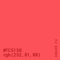 Цвет #FC5158 в цветовой модели RGB обозначается тремя октетами (252, 81, 88) в десятичном формате и #FC5158 в шестнадцатиричном (hex) формате, которые являются интенсивностью красного 252 (hex FC), интенсивность зелёного 81 (hex 51) и интенсивность синего 88 (hex 58).