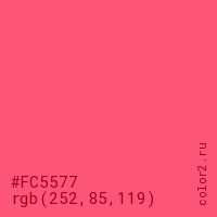 Цвет #FC5577 в цветовой модели RGB обозначается тремя октетами (252, 85, 119) в десятичном формате и #FC5577 в шестнадцатиричном (hex) формате, которые являются интенсивностью красного 252 (hex FC), интенсивность зелёного 85 (hex 55) и интенсивность синего 119 (hex 77).