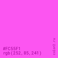 Цвет #FC55F1 в цветовой модели RGB обозначается тремя октетами (252, 85, 241) в десятичном формате и #FC55F1 в шестнадцатиричном (hex) формате, которые являются интенсивностью красного 252 (hex FC), интенсивность зелёного 85 (hex 55) и интенсивность синего 241 (hex F1).