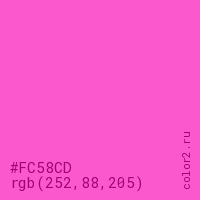 Цвет #FC58CD в цветовой модели RGB обозначается тремя октетами (252, 88, 205) в десятичном формате и #FC58CD в шестнадцатиричном (hex) формате, которые являются интенсивностью красного 252 (hex FC), интенсивность зелёного 88 (hex 58) и интенсивность синего 205 (hex CD).