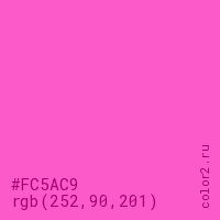 Цвет #FC5AC9 в цветовой модели RGB обозначается тремя октетами (252, 90, 201) в десятичном формате и #FC5AC9 в шестнадцатиричном (hex) формате, которые являются интенсивностью красного 252 (hex FC), интенсивность зелёного 90 (hex 5A) и интенсивность синего 201 (hex C9).
