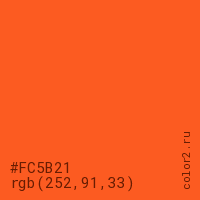 Цвет #FC5B21 в цветовой модели RGB обозначается тремя октетами (252, 91, 33) в десятичном формате и #FC5B21 в шестнадцатиричном (hex) формате, которые являются интенсивностью красного 252 (hex FC), интенсивность зелёного 91 (hex 5B) и интенсивность синего 33 (hex 21).