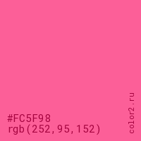 Цвет #FC5F98 в цветовой модели RGB обозначается тремя октетами (252, 95, 152) в десятичном формате и #FC5F98 в шестнадцатиричном (hex) формате, которые являются интенсивностью красного 252 (hex FC), интенсивность зелёного 95 (hex 5F) и интенсивность синего 152 (hex 98).