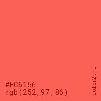 Цвет #FC6156 в цветовой модели RGB обозначается тремя октетами (252, 97, 86) в десятичном формате и #FC6156 в шестнадцатиричном (hex) формате, которые являются интенсивностью красного 252 (hex FC), интенсивность зелёного 97 (hex 61) и интенсивность синего 86 (hex 56).